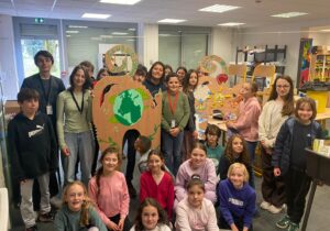 C’est donc à travers des actions concrètes comme les goûters locaux, le tri sélectif, la création de carrés potagers, la réalisation d’une mappemonde géante avec des canettes recyclées, le tri du papier pour la réalisation d’éco-blocs, le club du “Bien manger”, le travail autour du gaspillage alimentaire à la cantine, … Voici quelques exemples qui animent ce groupe d’une cinquante d’élèves qui ont envie d’agir pour préserver notre maison commune.